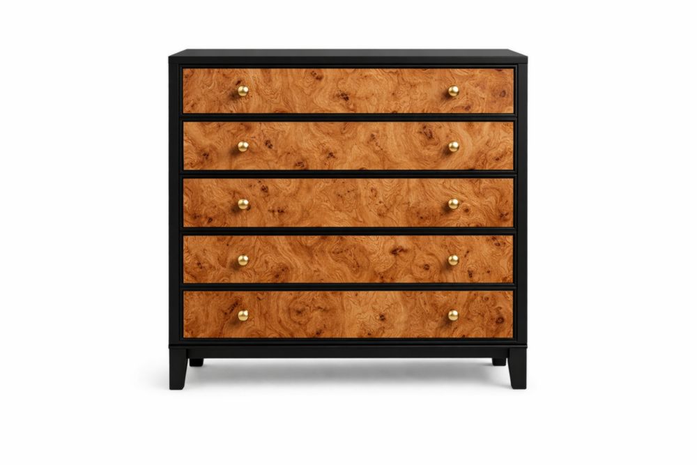 Commode 5 tiroirs bois de placage Noir/Naturel avec poignées dorées