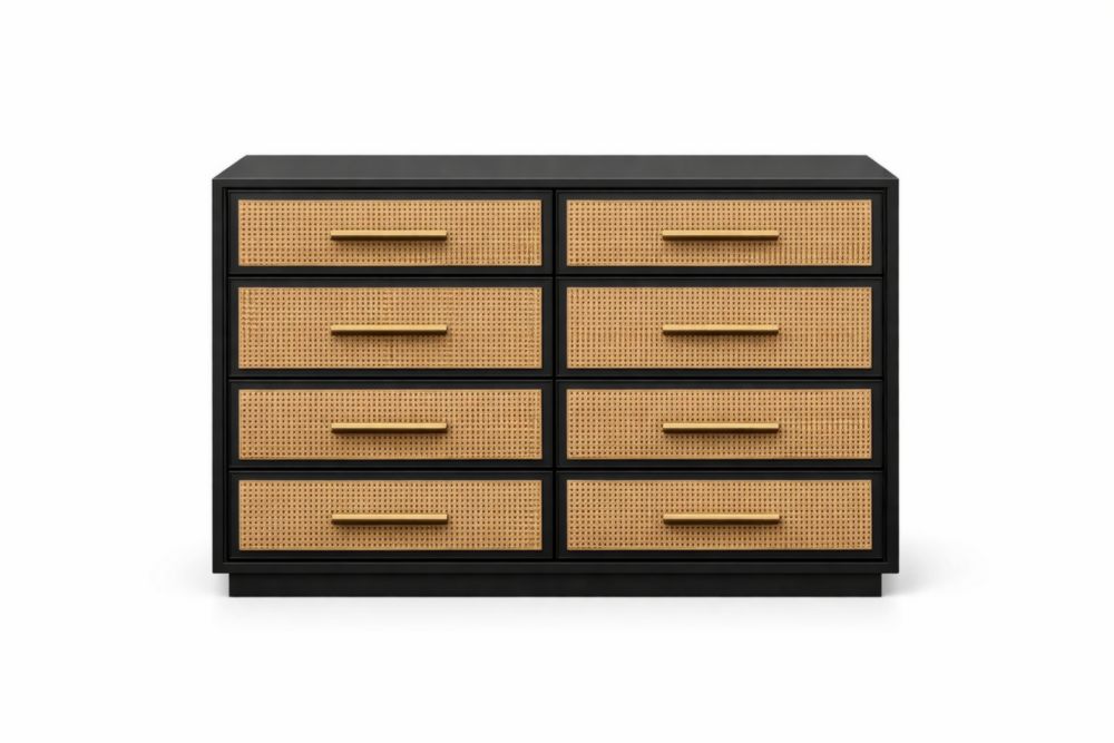 Commode en Bois avec Tiroirs en Rotin, 8 Tiroirs, Noir et Naturel